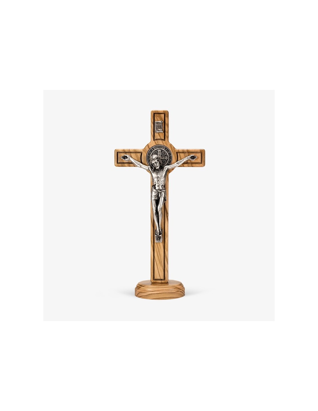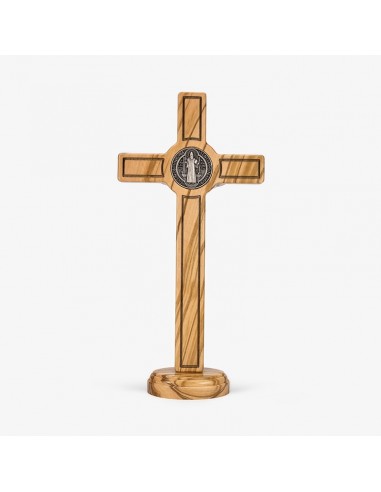 crocifisso di san benedetto in legno di ulivo con corpo e medaglia in metallo colore argento