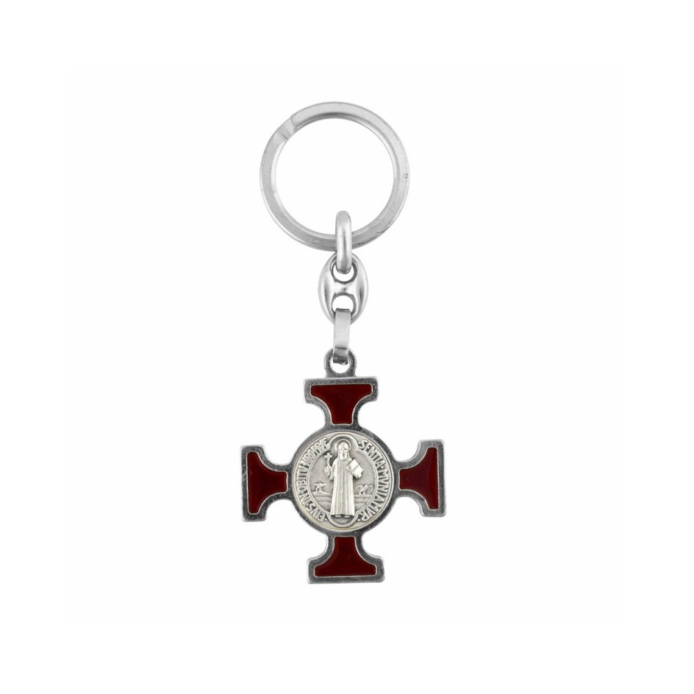 Portachiavi croce celtica di San Benedetto in metallo argentato e smalto marrone