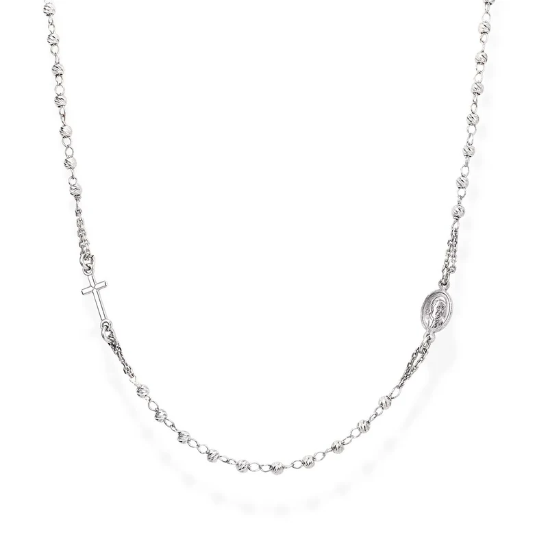 Rosario girocollo in argento 925 rodiato con grani diamantati da 3 mm, croce e medaglietta rappresentante la Madonna Miracolosa. La collana ha lunghezza regolabile da 48 a 50 cm con chiusura a moschettone e catenina di allungo.